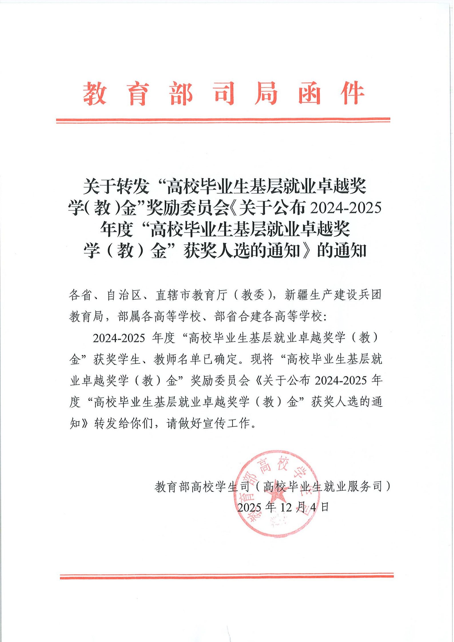 2024-2025年度“高校毕业生基层就业卓越奖学(教)金”获奖高校毕业生、教师名单