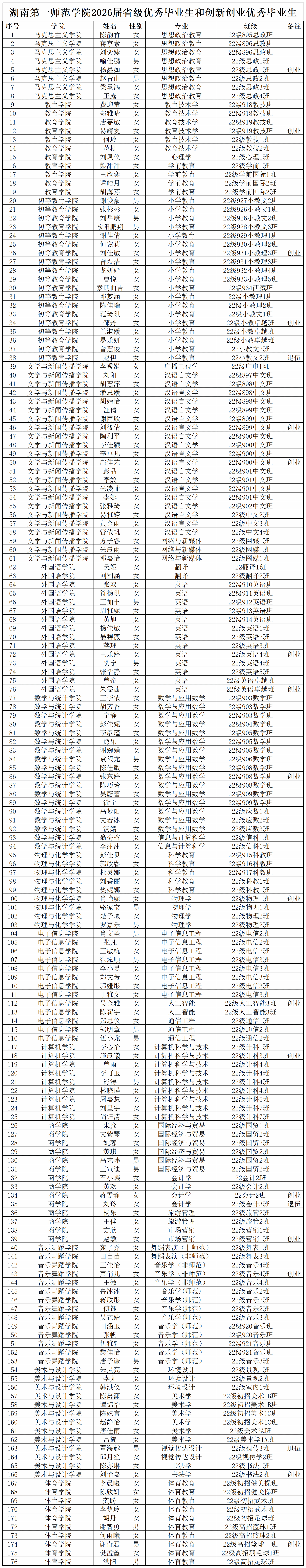 根据湖南第一师范学院《关于评选2026届优秀毕业生和创新创业优秀毕业生的通知》要求,经本人申报,各学院审核推荐,招生就业处复核,拟推荐陈韵竹等159名同学为2026届省级优秀毕业生,杨鑫如等17名同学为2026届省级创新创业优秀毕业生,现将名单予以公示。